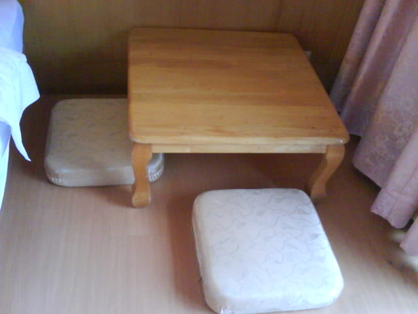 讓我很開心的和室桌;有四個墊子,它上面很快就擺上了茶盤茶具還有配茶的小點心──